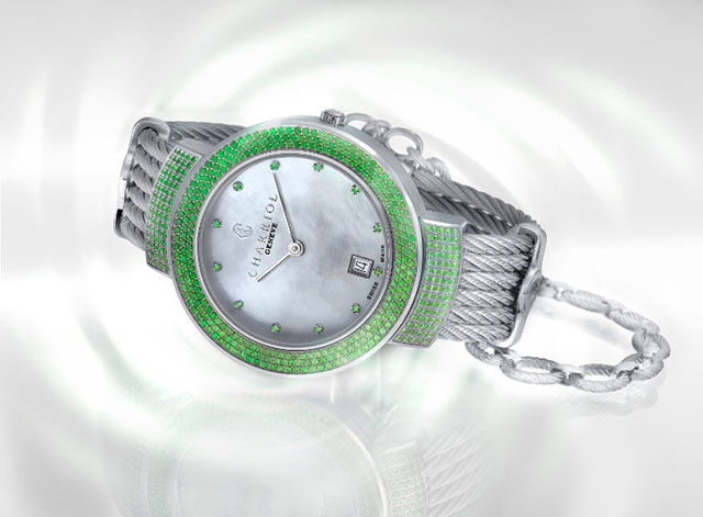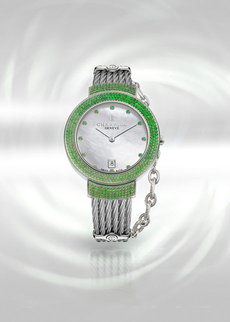 Vẫn trung thành với thiết kế quen thuộc là mặt số kích thước nữ tính 35mm từ thép không rỉ 316L và dây đeo họa tiết cáp xoắn biểu tượng được lấy cảm hứng từ chiếc vòng cổ của người Celtic xưa, Charriol đã giúp St-Tropez™ Greenlight bừng sáng với một loại đá màu xanh miên man ngọt ngào Tsavorites. Có màu xanh nhạt hơn ngọc lục bảo, nhưng Tsavorites sở hữu khả năng phản quang cao nên tạo ra ánh lấp lánh vượt trội. Đối lập với vẻ rực rỡ của Tsavorite, Charriol đã nhấn nhá màu xà cừ trắng thanh thoát tạo sự tương phản nhẹ nhàng trên mặt số của chiếc đồng hồ.