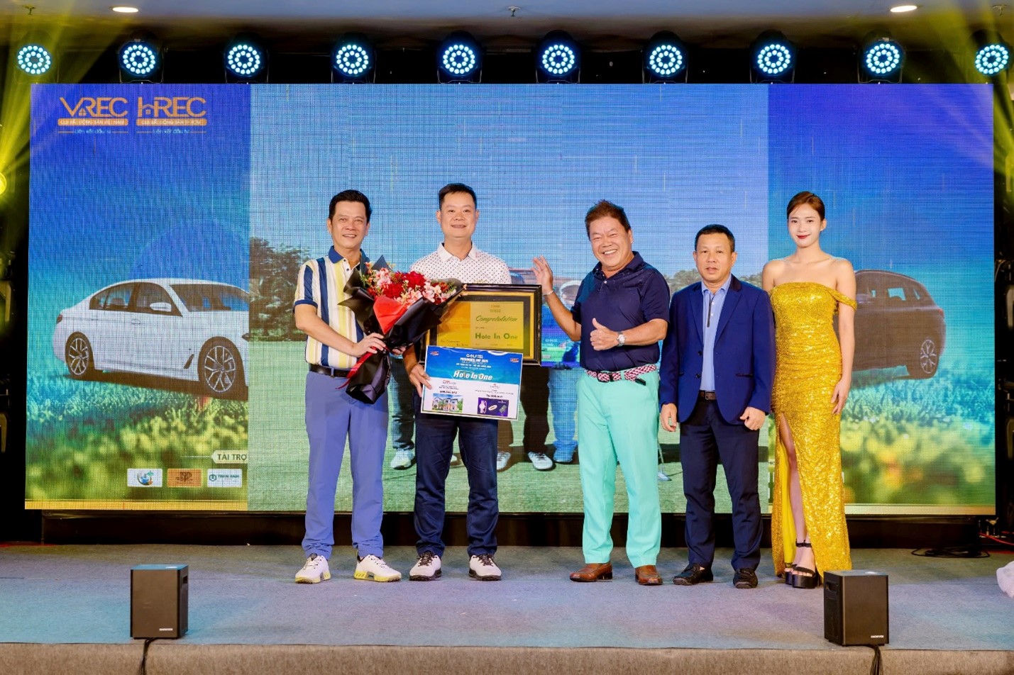 Đại diện các nhà tài trợ giải thưởng Hole-in-One cùng anh Nguyễn Mạnh Cương tại buổi tiệc sau giải.