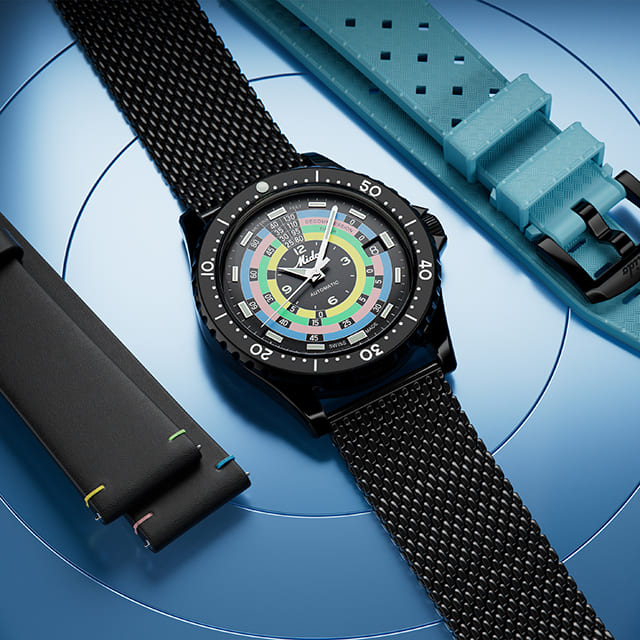Mỗi tân phẩm trong số 1961 chiếc được đựng trong một hộp đựng đặc biệt có kèm giấy chứng nhận phiên bản số lượng giới hạn. Hộp này có ngăn chứa thêm 2 dây đeo: ngoài dây lưới Milanese bằng thép không gỉ mạ PVD màu đen gắn theo đồng hồ, một dây bằng cao su màu xanh và dây còn lại bằng da bê màu đen, với những đường chỉ khâu đa màu lấy cảm hứng từ các màu trên mặt số. Mỗi dây đều có cơ cấu chốt để tháo dây ra thay dây rất dễ dàng mà không cần dụng cụ, có nghĩa là bạn có thể thay đổi kiểu dáng đồng hồ của mình cho phù hợp phong cách với từng trang phục, bối cảnh hay sự kiện khác nhau.