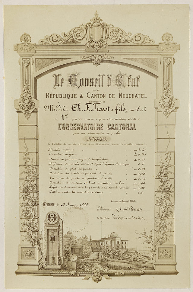 Kể từ năm 1869, các sản phẩm của Tissot thường xuyên được đưa vào thử nghiệm do Đài thiên văn Neuchâtel thực hiện và thương hiệu đã nhiều lần được vinh danh với sự công nhận cao nhất. Thương hiệu luôn muốn đảm bảo rằng các đồng hồ bấm giờ của mình có độ chính xác và tin cậy cao.
